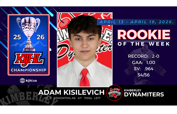 Adam Kisilevich provided the Kimberley Dynamiters with excellent goaltending to start the Kootenay International Junior Hockey League (KIJHL) Championship Final to earn the Rookie of…