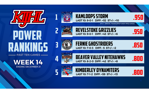 The Kootenay International Junior Hockey League (KIJHL) is pleased to announce its Power Rankings for Week 14. The Kamloops Storm defeated the Chase Heat 4-1…