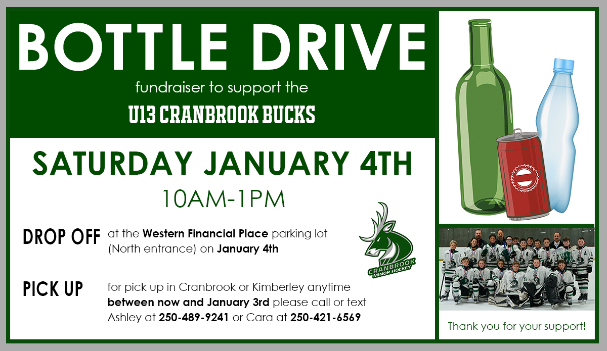 The U13 Cranbrook Bucks hockey team is having a bottle drive fundraiser on Saturday, January 4th. Please support our team’s fundraiser by dropping off your donations at the North entrance to Western Financial Place between 10am and 1pm.
