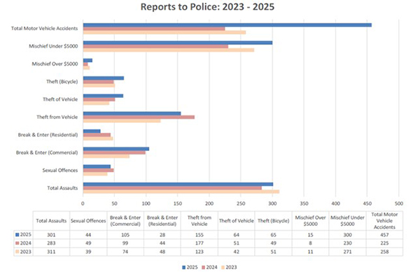 Overall, the Cranbrook RCMP report an increase in total assaults (301) in 2025, commercial break and enter (105), vehicle theft (64), bicycle theft (65), and motor vehicle accidents (457).
