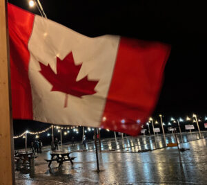 Pictured, teams played well into the night under the twinkling lights as the Canada Flag gently flapped in the breeze. The natural ice made interesting patterns and created an ongoing challenge for the players.