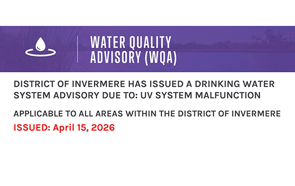 As of April 15, the District of Invermere has issued a Water Quality Advisory (WQA) for all areas within the district due to a UV system malfunction.