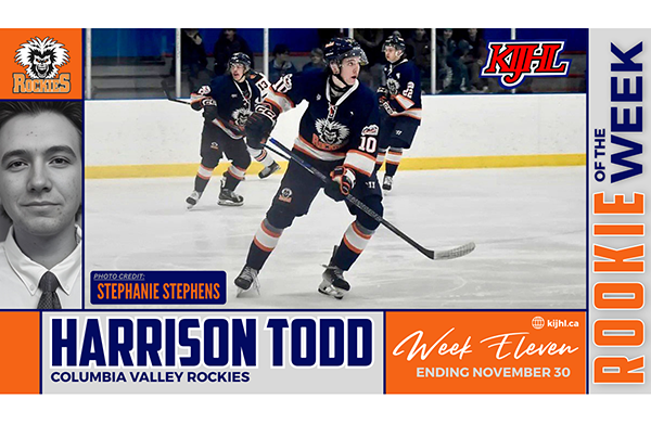 The Kootenay International Junior Hockey League (KIJHL) has announced Harrison Todd of the Columbia Valley Rockies as its Rookie of the Week for the period ending Nov. 30.