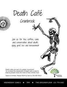 Cranbrook’s first Death Café will be held Wednesday, June 6, at 7 p.m. at 131-7th Avenue South. Attendees are asked to text an RSVP to 250-464-9613.