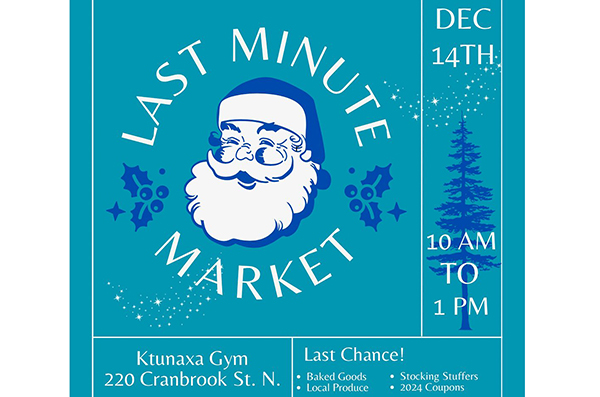 Find us at the Ktunaxa Gym (across from the Library) from 10 a.m. to 1 p.m. Find homemade cabbage rolls and lasagna for the freezer (makes a great gift for busy folks), holiday baking, local produce, eggs and meat and unique handmade gifts for anyone left on your list!