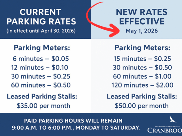 A reminder to residents, downtown business owners and those who work downtown Cranbrook, that parking meter and leased parking stall rates will be increasing starting May 1, as part of the city’s ongoing efforts to modernize downtown parking and support long-term infrastructure improvements.
