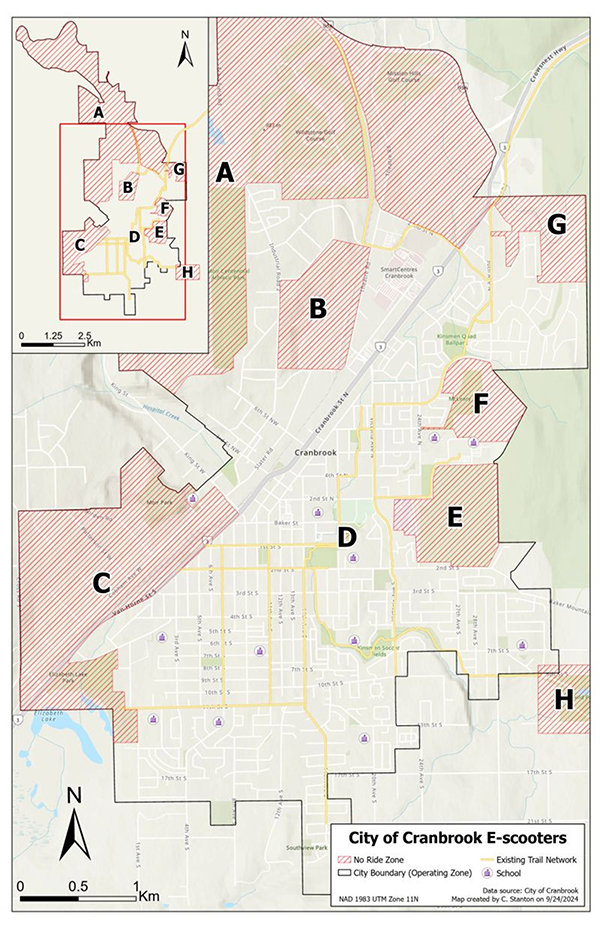e-Scooters are allowed to operate within nearly all areas of the City of Cranbrook with some specific no ride zones in force, including around the hospital, highways, City parks and golf courses. A map highlighting the no-ride zones is provided for information below.