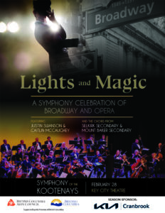 The Symphony of the Kootenays is delighted to present Lights and Magic , an exhilarating musical showcase bringing together some of the most beloved works from the worlds of Broadway and opera.