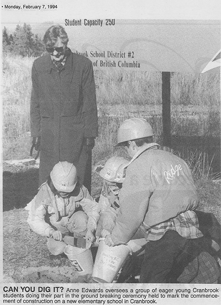 Anne Edwards oversees students in a ceremony for the construction of the new School District #2 (Currently SD#5) Kootenay Orchards School in this Cranbrook Daily Townsmen edition on Feb. 7, 1994.