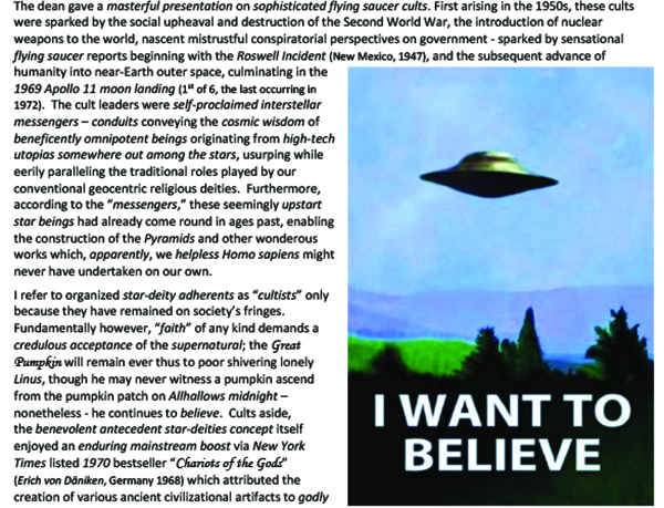 In Cranbrook, on December 17, at College of the Rockies, as part of its continuing Museia Series, Dean lectured a rapt audience of 50 on “Believing in the Unbelievable – UFO Religions.”