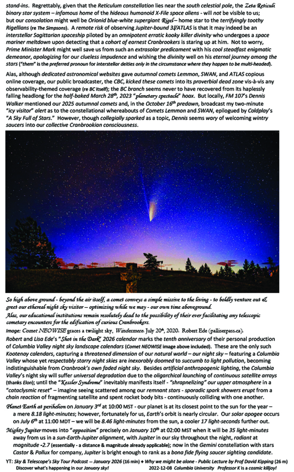 In Cranbrook, on December 17, at College of the Rockies, as part of its continuing Museia Series, Dean lectured a rapt audience of 50 on “Believing in the Unbelievable – UFO Religions.”