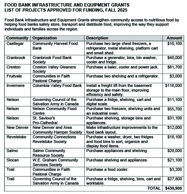 “All people in the Columbia Basin deserve access to locally grown, healthy food, and food banks are a vital resource for many,” said Katie Kendall, Senior Manager, Delivery of Benefits, Columbia Basin Trust. “These upgrades help ensure food is stored and handled safely and that food banks have the tools they need to operate efficiently.”
