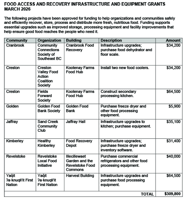 “Communities across the Basin are working hard to make sure fresh, nutritious food reaches the people who need it,” said Justine Cohen, Senior Manager, Special Initiatives for Columbia Basin Trust. “With better equipment and safer storage, organizations can save more good food from going to waste and get it onto the tables of local residents more quickly and reliably.”