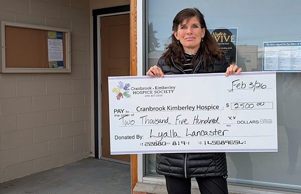 Cranbrook Kimberley Hospice Society would like to extend a special thank you to Lyalla Lancaster for her wonderful contribution of $2,500 toward the East Kootenay Hospice House Building Project.