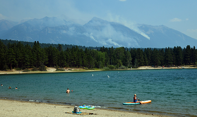 Lead image: The Bill Nye wildfire southeast of Wasa burns as beach goers go about keep cooling in the 36 C heat today (July 18) at Wasa Provincial Park. Ian Cobb/e-KNOW photo