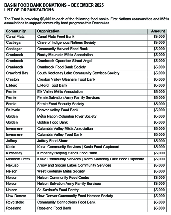 The Trust is supporting 40 Basin food banks and food programs, including the Columbia Valley Food Bank in Invermere, with a donation of $5,000 to support food access and seasonal hampers.