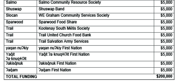 The Trust is supporting 40 Basin food banks and food programs, including St. Saviour’s Food Pantry in Nelson, with a donation of $5,000 to support food access and seasonal hampers.