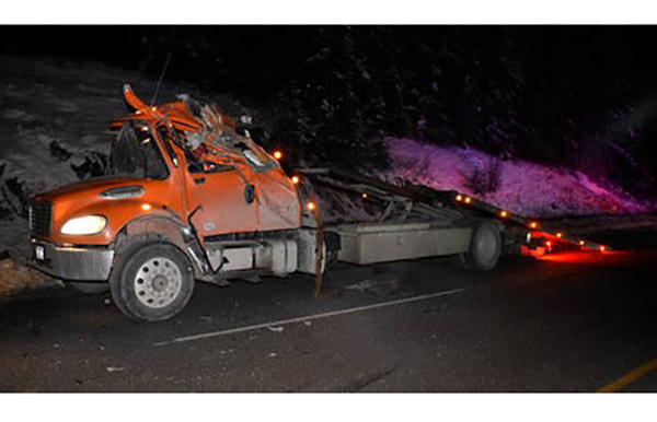 Lead image: A destroyed tow truck after it was struck by a tractor trailer that failed to Slow Down and Move Over. BC Highway Patrol photos