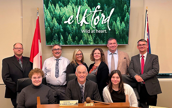 Lead image: Back row left to right: Councillors Jason Meldrum, Duncan McDonald, Shawna Bryant, Tathlina Lovlin, Len Gostick and Bert Schalekamp. Front row left to right: Junior Youth Councillor Alex Sheppard, Mayor Steve Fairbairn and Senior Youth Councillor Abigail Talbot. District of Elkford photo