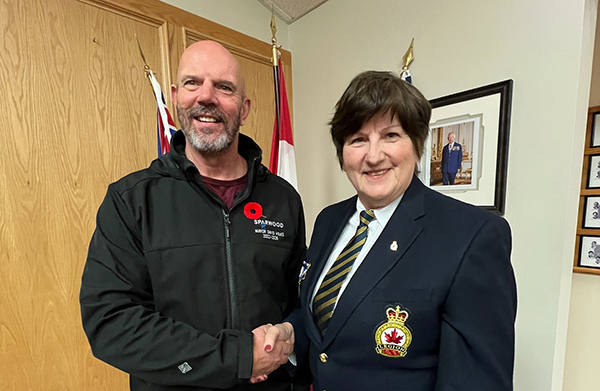 The Remembrance Day Poppy Campaign has officially started with Irene Mills, President of the Royal Canadian Legion Branch No. 81, pinning a poppy on District of Sparwood Mayor David Wilks.