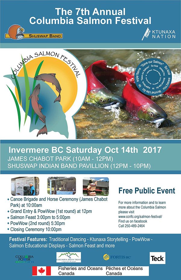 The seventh annual Columbia Salmon Festival is this Saturday, Oct. 14, at Invermere’s James Chabot Provincial Park and the Shuswap Indian Band Pavilion.